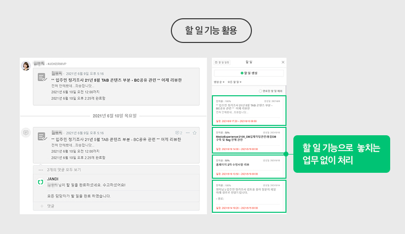 잔디의 할 일 기능은 관리자로서 유용하게 쓰는 기능입니다. 두 그룹을 관리하고 있다 보니 하루에도 수백 개의 알림을 받습니다. 요청이 들어왔을 때 바로 해결할 수 있는 일은 처리하고, 바로 처리할 수는 없고 언젠가 해야 하는데 놓칠 수 있는 일들을 할 일 기능을 활용해서 빠짐 없이 업무를 처리하고 있습니다. 알림센터 기능을 통해 관련자를 태그하고 업무 요청이 온 메시지 자체를 할 일로 체크합니다. 혼자 해결할 수 없고 팀원과 함께 협업해야 할 때나 업무 지시를 한 상태라면 25%, 업무를 다 끝내면 100%로 척도를 나눠서 사용하고 있습니다. 업무를 완료하면 칭찬해줘서 더 재미있게 쓰고 있습니다.