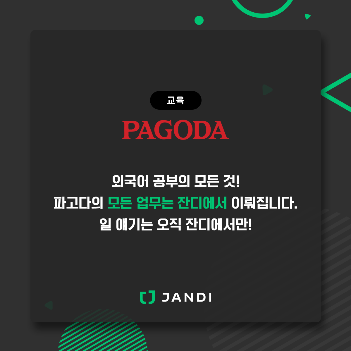 [잔디로 일하는 기업] 외국어 공부의 모든 것! 파고다 게시일: 2021. 06. 28 Share 🕑 리딩타임: < 1 분 잔디 도입 후 업무와 일상이 분리돼 업무 효율이 높아졌습니다 대한민국 외국어 교육의 선구자 파고다도 잔디로 일하고 있습니다. 외국어 공부의 모든 것! 파고다는 현재 오프라인 성인 및 중고생학원, 온라인학습, 교육 출판 등의 다양한 분야에서 교육 사업을 펼쳐 나가고 있습니다. 파고다는 잔디를 도입해 일과 생활을 명확히 구분했습니다. 파고다의 모든 업무는 잔디에서 이뤄집니다. 파고다는 업무 채널을 잔디로 일원화해 구성원들이 일에만 집중할 수 있는 환경을 만들었습니다. 오직 일 얘기만 하는 잔디에서 파고다의 업무 집중력도 올라갑니다. 포스트 뷰: 201 무료 메신저무료협업툴업무용 메신저업무용협업툴잔디 Share