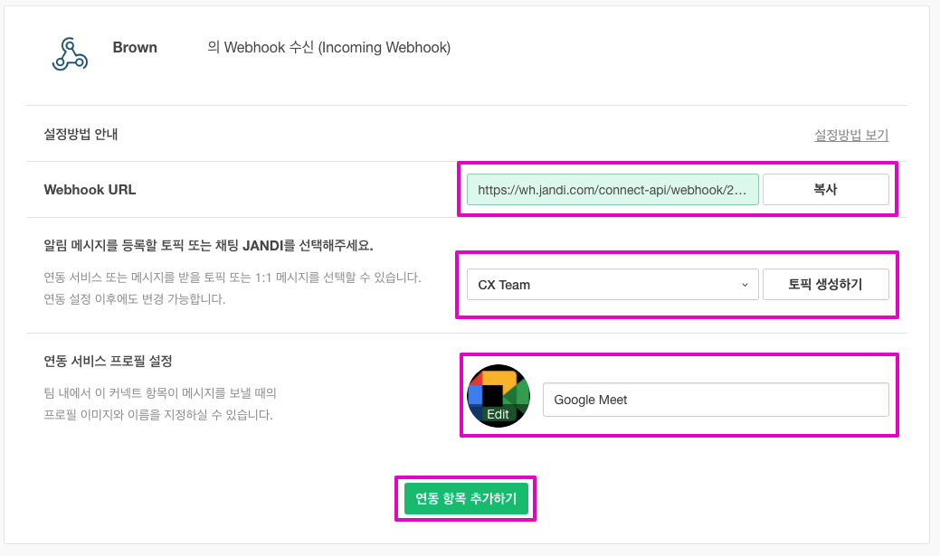 3-7) ‘연동 항목 추가하기’ 버튼을 클릭해 잔디 커넥트 항목 생성을 완료합니다.