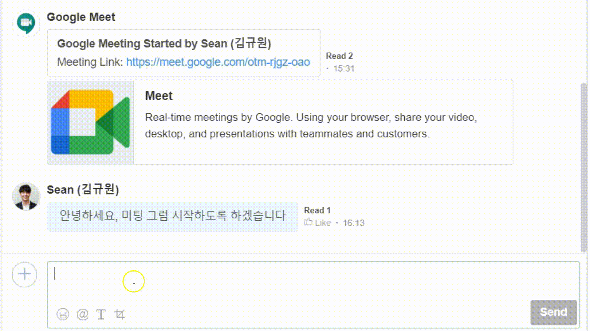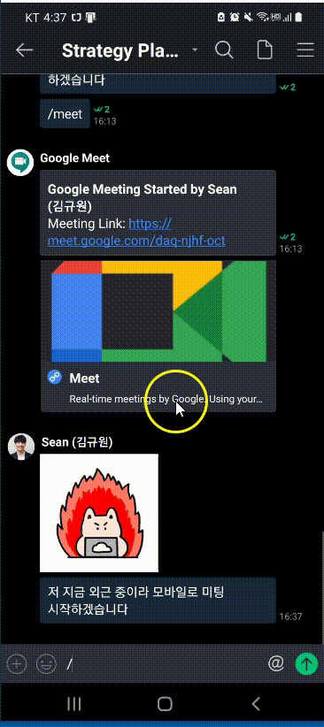 - Google Meet를 시작할 키워드를 입력합니다. (ex. /meet, /구글미트 등)