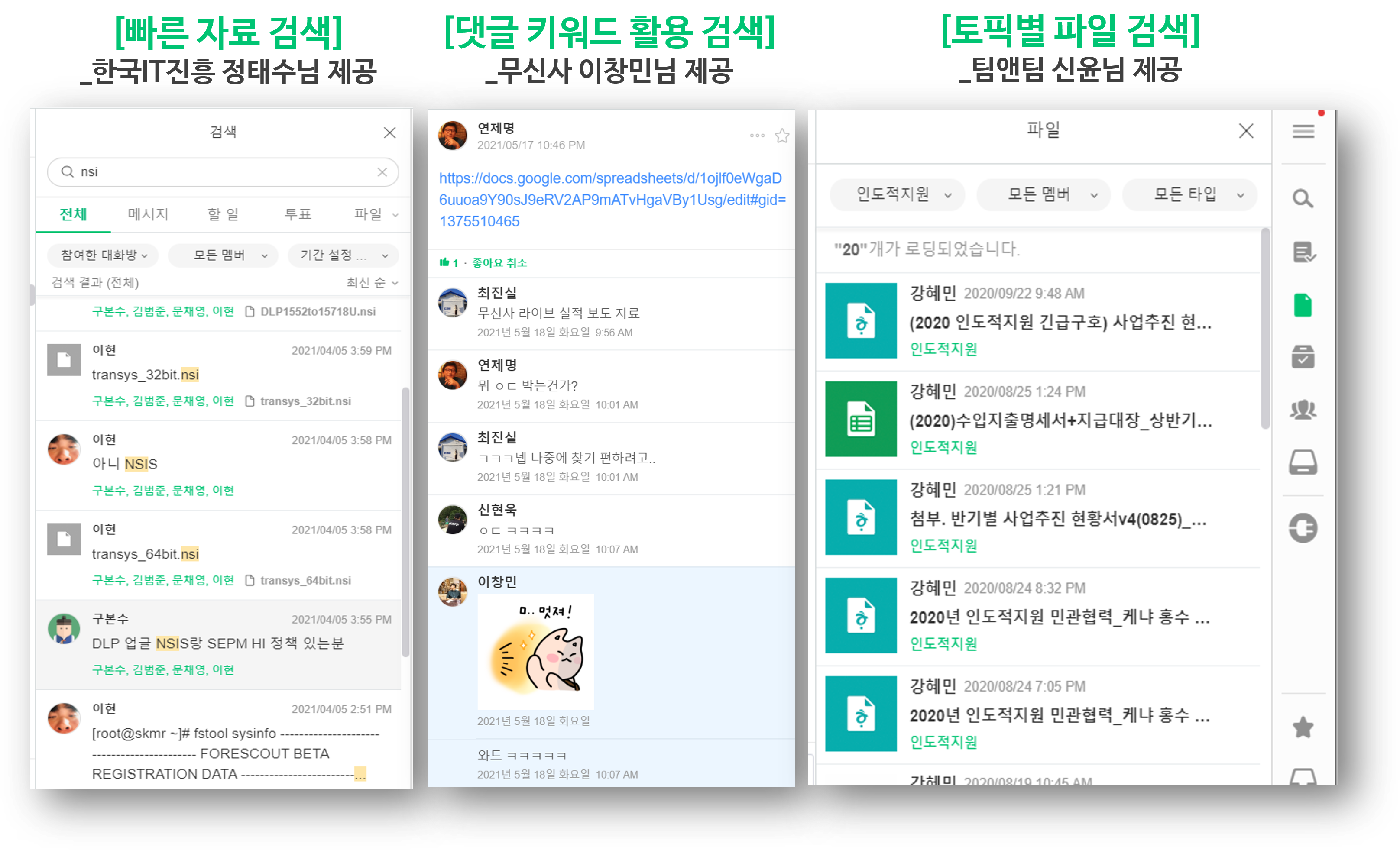 관련 자료들을 모두 찾아야 하는 경우에는 ‘참여한 대화방’ 혹은 ‘모든 대화방’으로 필터링해 검색하고, 사업별 자료가 필요한 경우에는 해당 사업의 토픽에서 검색하면 파일이나 대화 내용을 쉽게 추적할 수 있습니다.