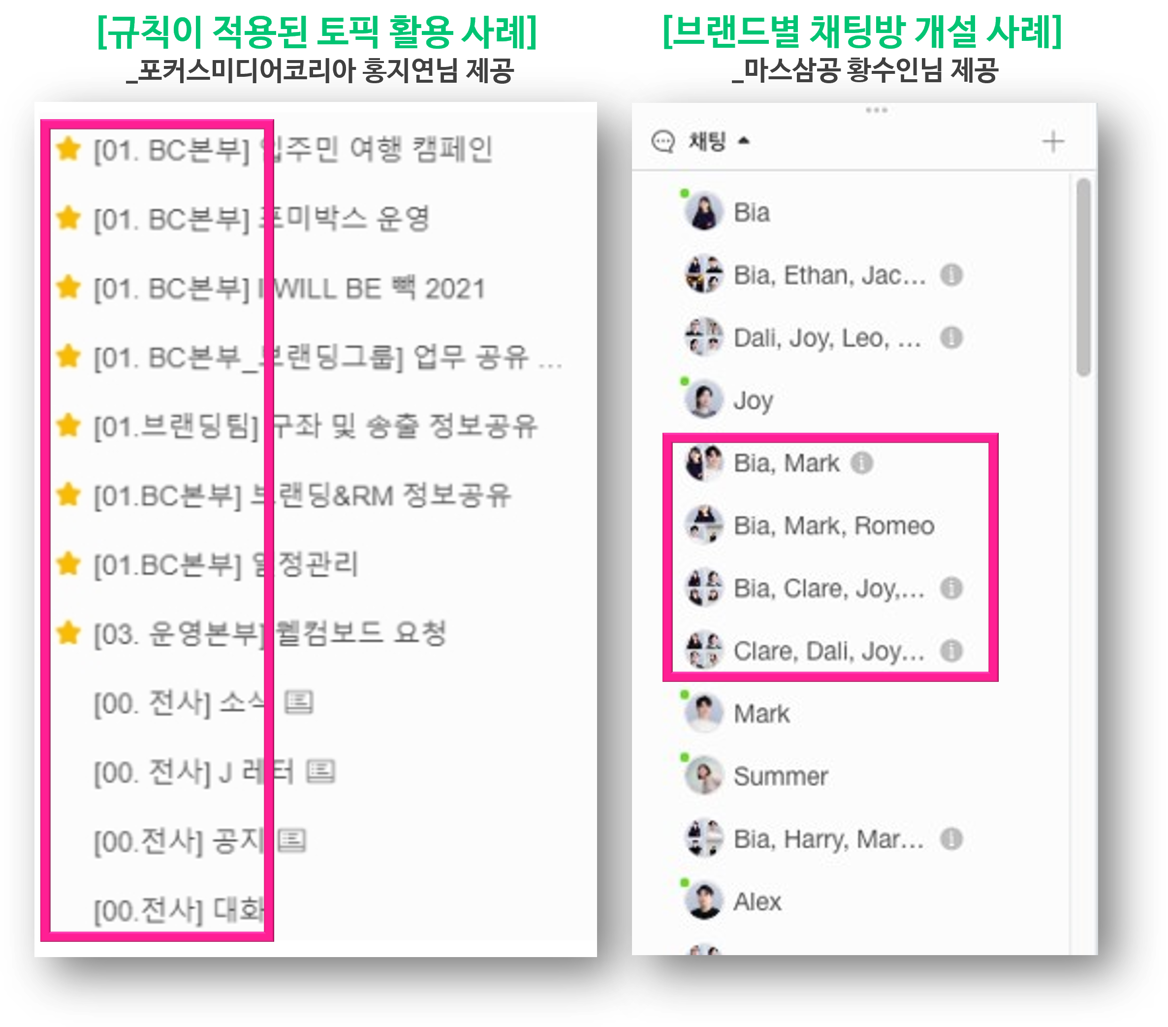 업무를 진행하다 보면 토픽과 채팅이 계속해서 늘어나게 되는데요. 이 때 토픽 이름을 생성하는 규칙을 만들어 사용하면 편리합니다. 토픽의 즐겨찾기 기능까지 활용하면 금상첨화이고요!