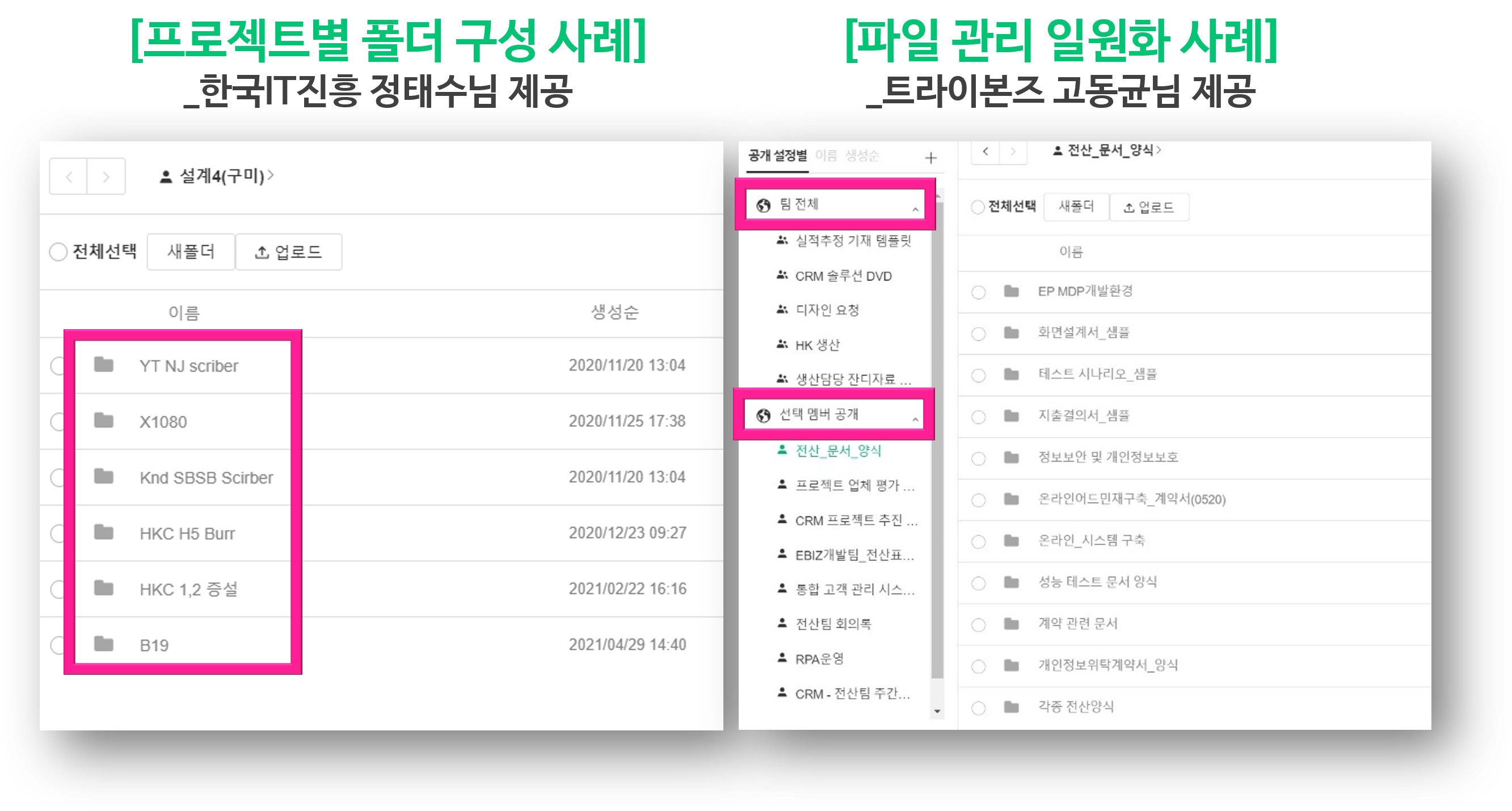 업무 진행 시 도면을 주고 받을 일이 많은 설계팀의 경우, 드라이브를 활용해 프로젝트별로 폴더를 구성하고 각자 수정한 도면을 업로드해 업무를 진행합니다.