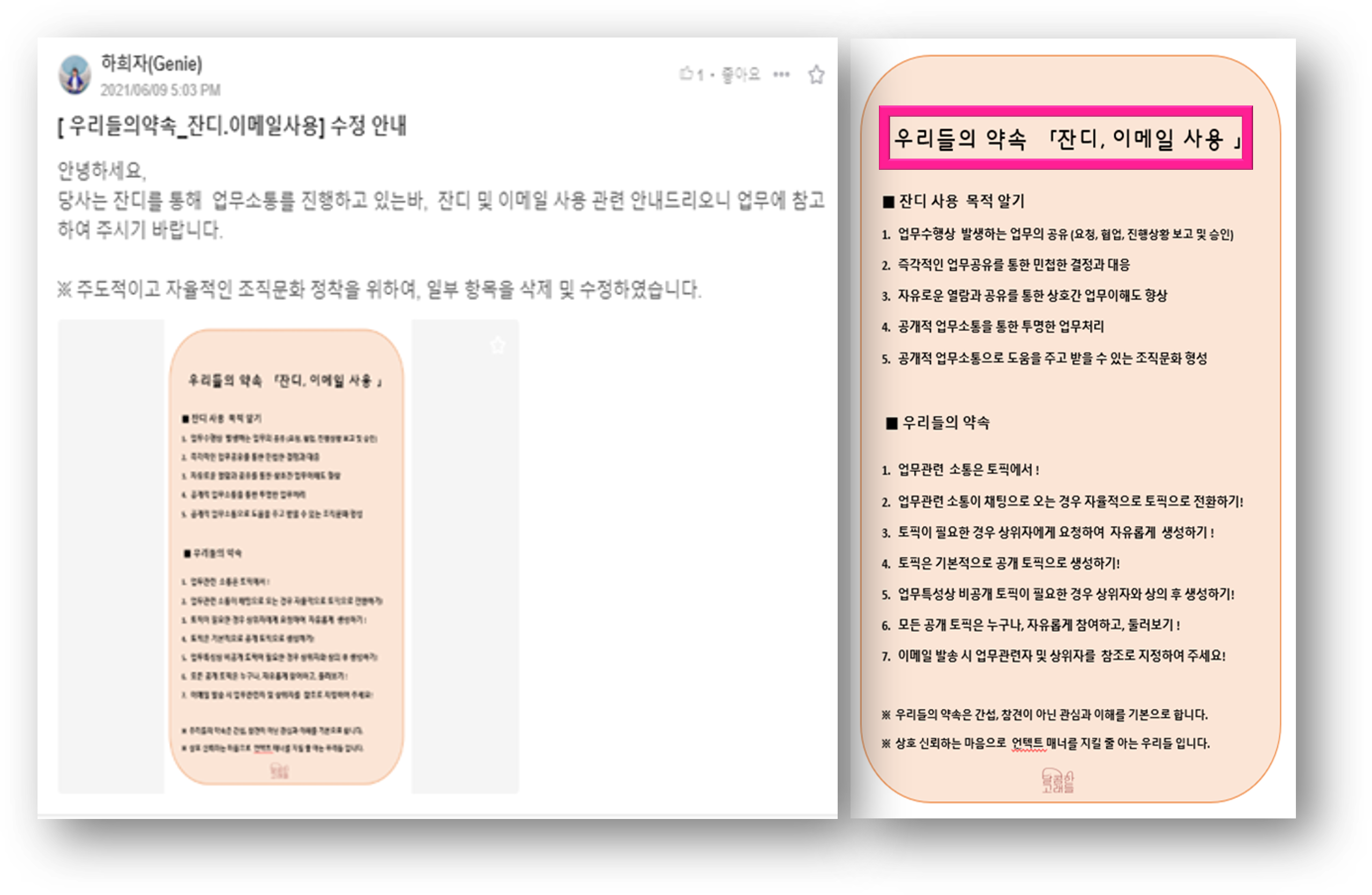 ✅ 열린 채용, 자유토론방 등의 전사 토픽은 직원과 임원 간의 장벽을 허물 수 있는 계기가 되고 있습니다.