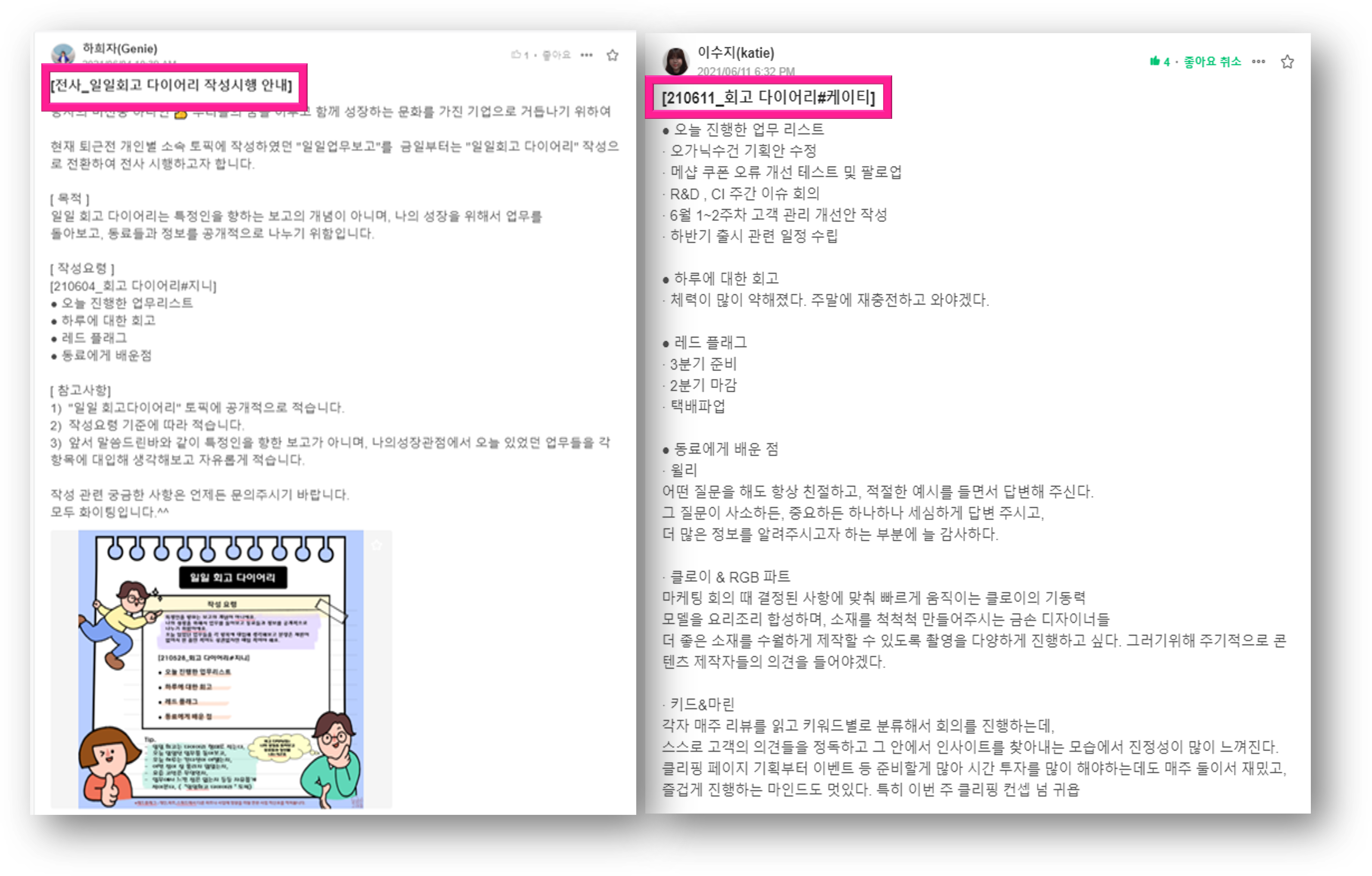 ✅ 하루에 대한 회고, 일을 통해 발견한 적신호, 문제가 될 법한 레드 플래그, 동료에게 배운 점 등을 ‘일일회고 다이어리’ 토픽에서 공유하고, 멤버들의 동반 성장에 기여하고 있습니다.