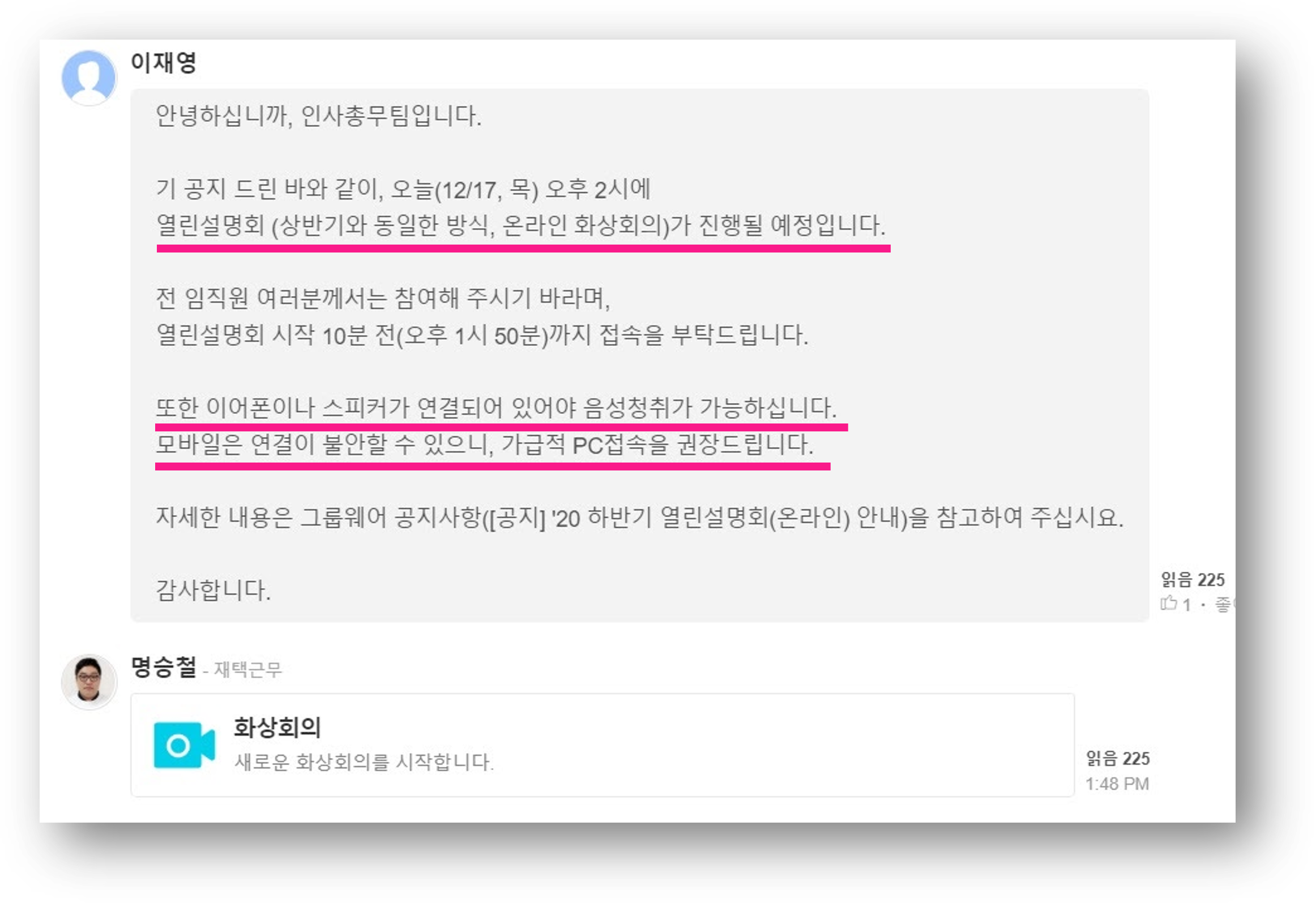 ✅ 연 2회 진행되는 전 직원 대상(230여 명) 열린 설명회를 화상회의로 진행해 경영 현황과 향후 비전을 공유합니다.