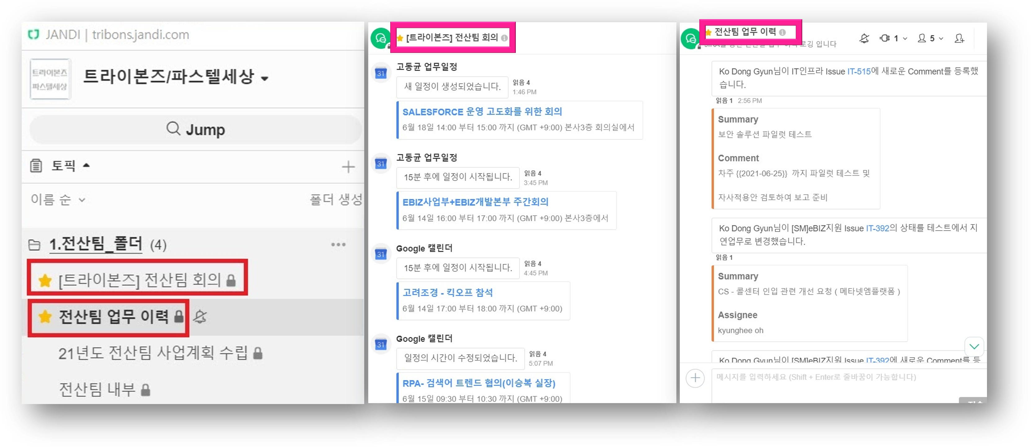 ✅ Jira 연동: 전산팀 6명의 업무 진행 현황을 토픽에서 실시간으로 확인하고 주/월간 단위 회의에 참고자료로 활용합니다.