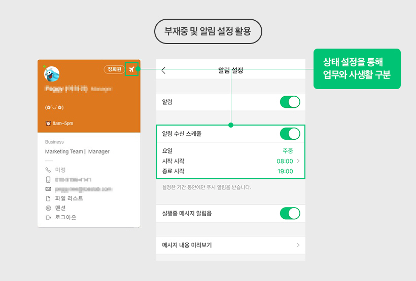 잔디 도입 전에는 개인 메신저인 카카오톡을 사내 메신저로 사용하였습니다. 익숙한 UI(User Interface) 이기에 사내에서 사용하기 위한 적응 시간과 비용은 들지 않는 장점이 있었지만, 불명확한 사생활 구분과 무분별한 채팅방 형성되는 등 더욱 많은 단점이 있었습니다. 업무에 집중하던 중에 카카오톡 메시지가 오면 빠르게 읽고 회신해야 한다는 압박이 있었습니다. 그리고 개인 메시지와 업무 메시지가 섞여 업무 집중도도 떨어졌습니다. 업무시간 외 연락에도 빠른 확인과 회신을 하지 않으면 ‘일 하지 않는다’라는 죄책감을 느낄 때도 있었습니다. 잔디 도입 후에는 완전히 바뀌었습니다. 일과 사생활이 구분이 된다는 말이 어떤 것인지 몸소 체험하였습니다. 부재중 설정을 통해 서로의 사생활을 존중하게 되었고, 개인 메시지 오픈이 줄어들면서 업무 몰입도 높아졌으며, 토픽과 폴더를 적절히 활용함으로써 명확한 업무 관리와 체계가 형성되었습니다.