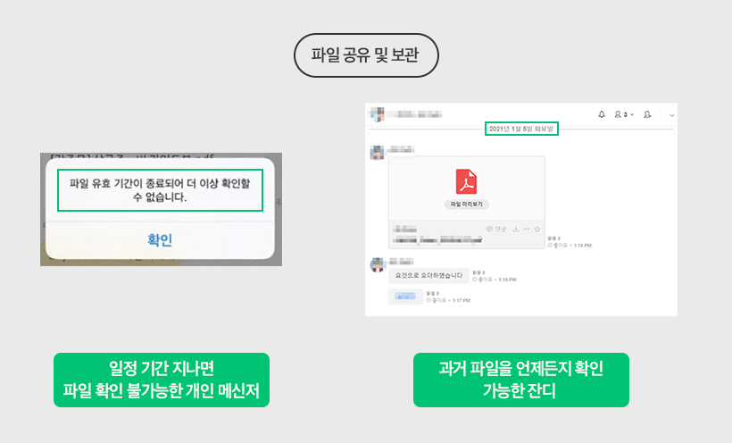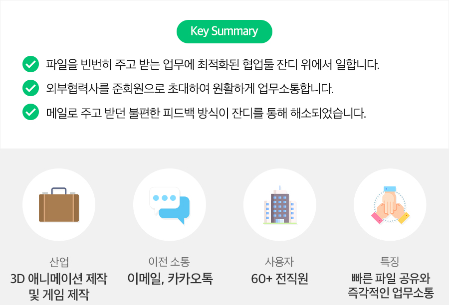 카카오톡으로 파일을 주고받으며 일했던 분이시라면 유효기간이 만료된 파일 때문에 불편했던 경험이 있을 것입니다. 키링은 애니메이션 작업 파일을 자주 주고받기 때문에 잔디 도입 전에 이러한 상황이 잦았습니다. 다른 구성원 또는 해당 파일을 공유한 구성원에게 만료된 파일을 요청할 때 죄송한 마음과 함께 프로페셔널하지 못한 모습이 비친 것 같아 불편했던 마음은 잔디를 통해 해결되었습니다. 파일 영구 보관이 가능하기에 개인 파일도 ‘JANDI (나와의 대화)’ 채팅에 보내 보관하기도 하고, 가끔씩 최종본 이전의 Draft 파일을 다시 찾을 때에도 디바이스 내에서 찾기보다는 잔디에서 찾는 것이 더욱 빠르고 편리합니다. 키링에서 제작 파일 관리 중요성은 상당하기에, 이제 잔디는 저희 구성원들에게 없어서는 안 될 존재가 되었습니다.