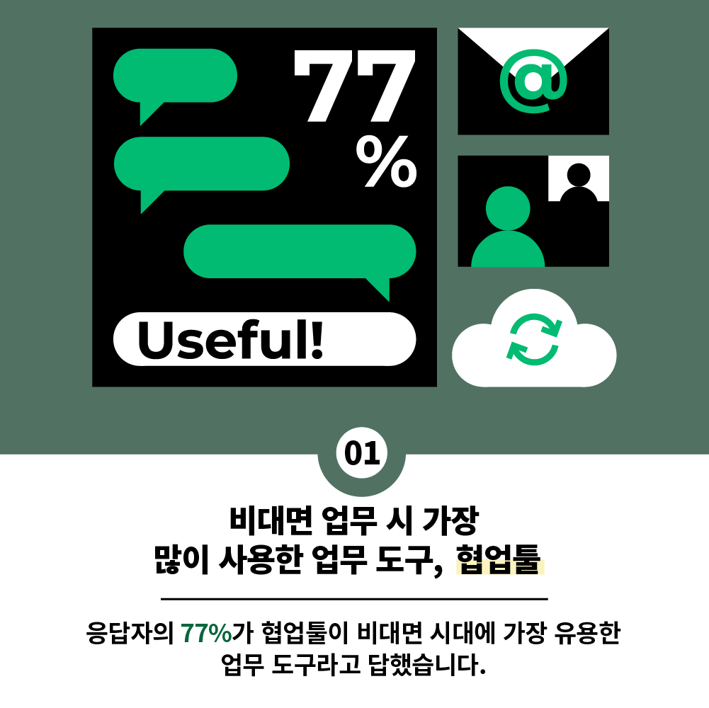 응답자의 77%가 협업툴이 비대면 시대에 가장 유용한 업무 도구라고 답했습니다.