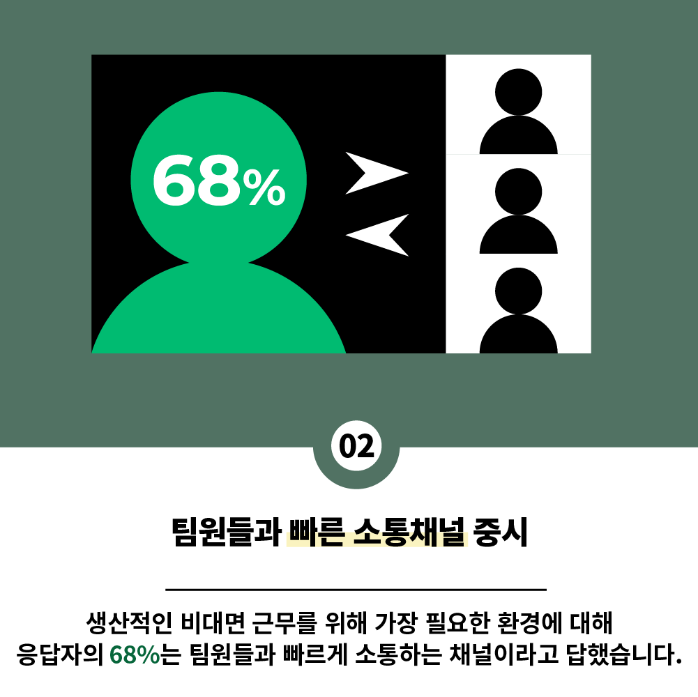 생산적인 비대면 근무를 위해 가장 필요한 환경에 대해 응답자의 68%는 팀원들과 빠르게 소통하는 채널이라고 답했습니다.