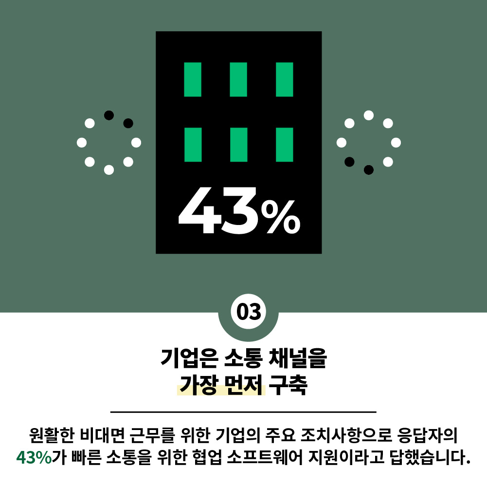 원활한 비대면 근무를 위한 기업의 주요 조치사항으로 응답자의 43%가 협업툴과 같은 빠른 소통을 위한 소프트웨어 지원이라고 답했습니다.