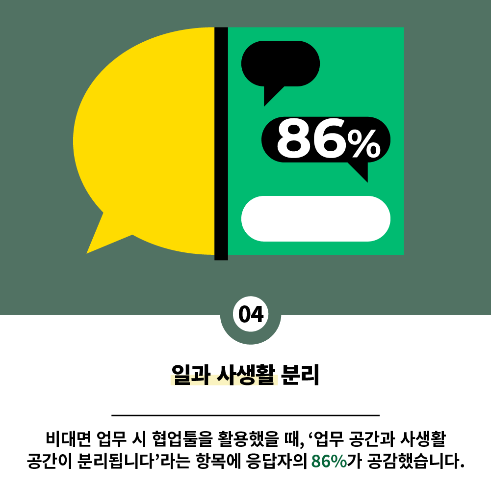 비대면 업무 시 협업툴을 활용했을 때, ‘업무공간과 사생활 공간이 분리됩니다’라는 항목에 응답자의 86%가 공감했습니다.