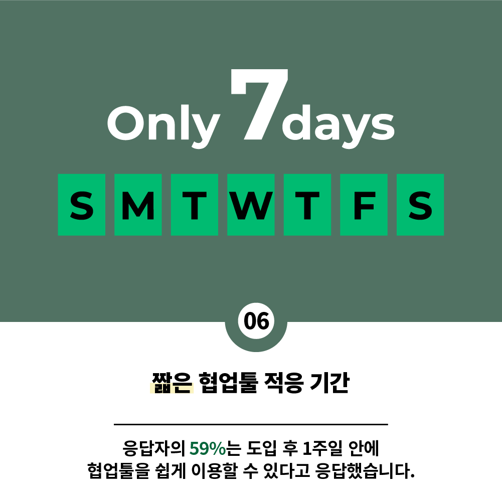 응답자의 59%는 도입 후 1주일 안에 협업툴을 쉽게 이용할 수 있다고 응답했습니다.