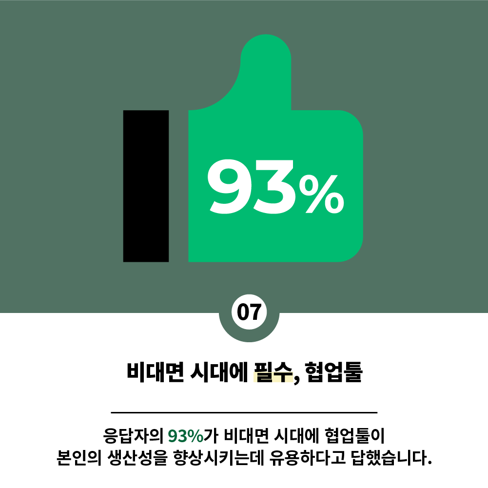 응답자의 93%가 비대면 시대에 협업툴이 본인의 생산성을 향상시키는데 유용하다고 답했습니다.
