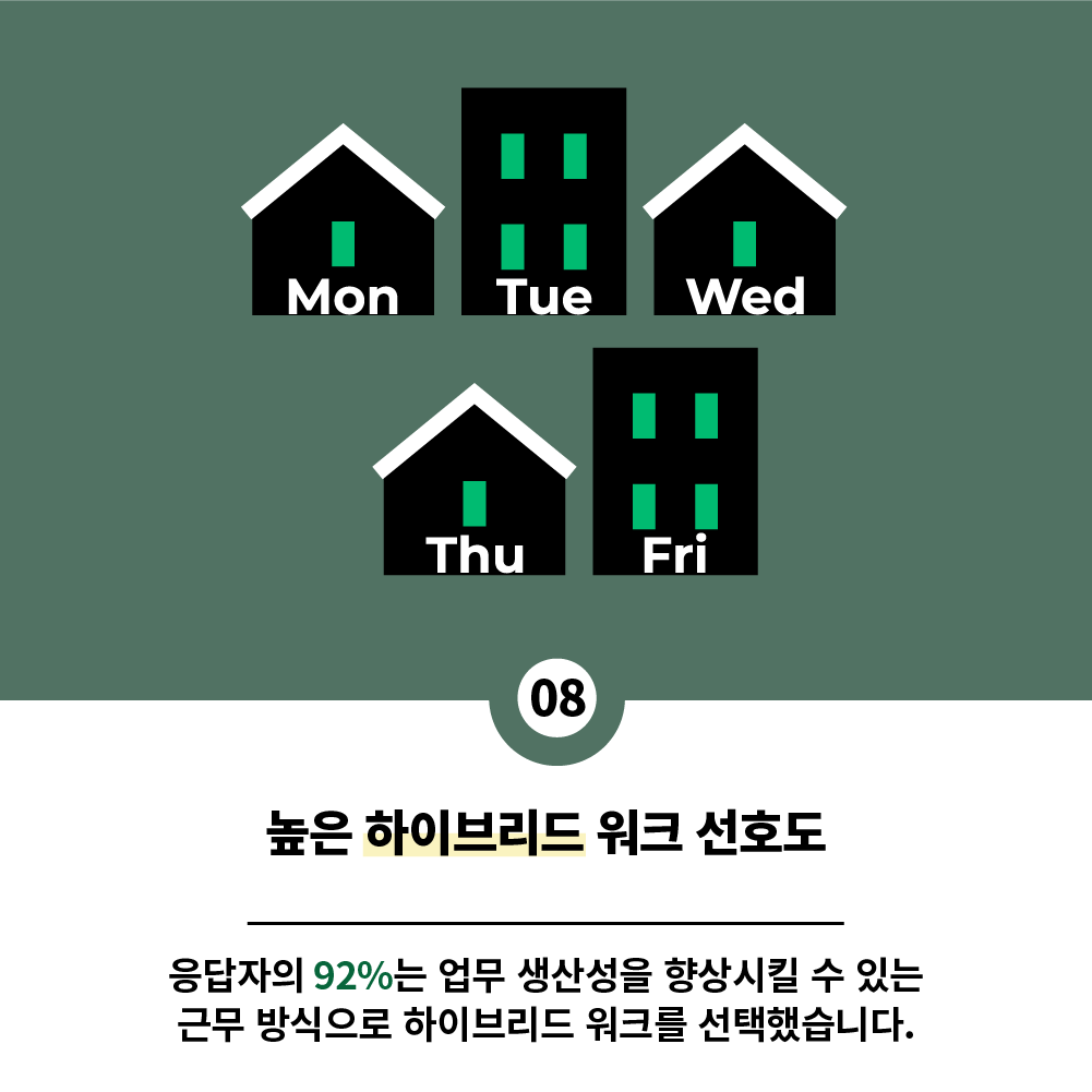 응답자의 92%는 업무 생산성을 향상시킬 수 있는 근무 방식으로 하이브리드 워크를 선택했습니다.