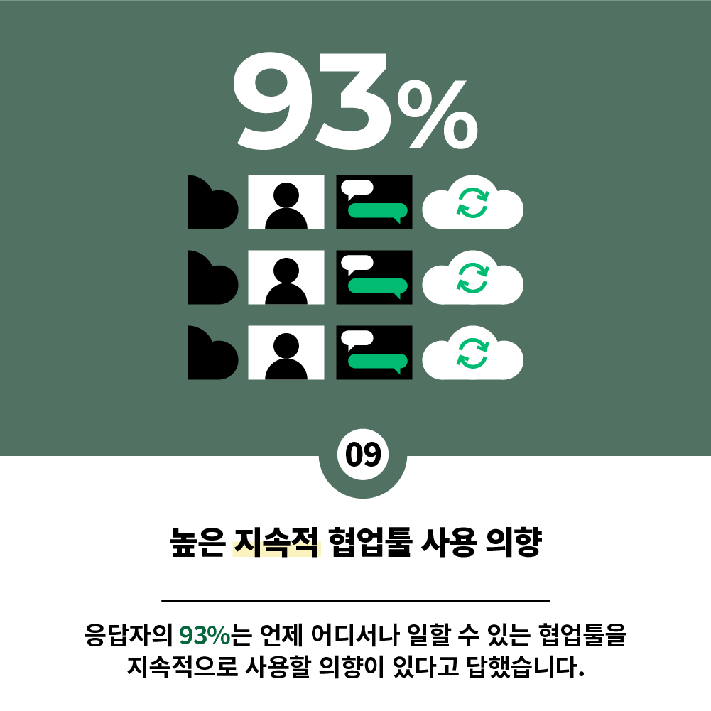 응답자의 93%는 언제 어디서나 일할 수 있는 협업툴을 지속적으로 사용할 의향이 있다고 답했습니다.