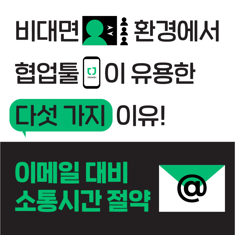 일상이 되어버린 비대면 근무를 대비해 기업은 구성원 간의 빠른 소통 채널 구축에 힘썼으며, 이에 협업툴은 비대면 근무의 핵심이 됐습니다. 개인적인 대화와 업무 대화가 혼재되어 있고 주요 문서 관리가 불가능한 카카오톡과 같은 개인용 메신저의 불편함을 협업툴이 해소했습니다. 특히 협업툴 ‘잔디’는 도입 후로부터 1주일이라는 짧은 기간내에 익숙하게 활용할 수 있으며, 다수의 직장인들은 이메일 사용 대비 일주일간 315분, 약 5시간 15분의 소통 시간을 절약할 수 있었습니다.