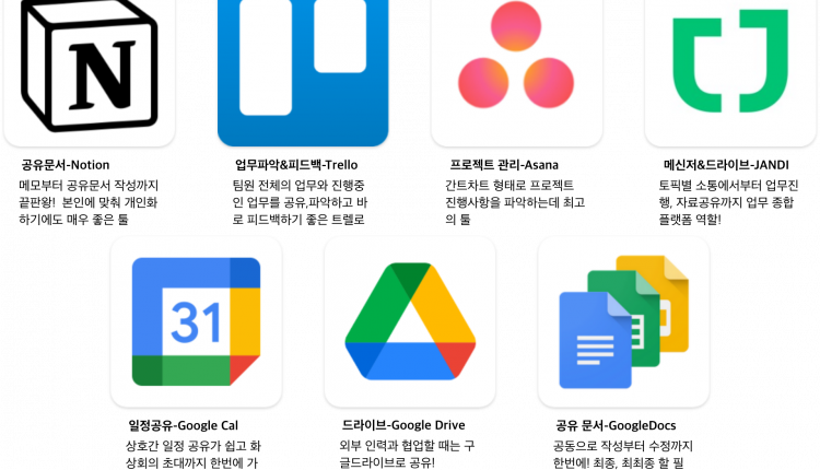 - 각자가 입맛에 맞는 툴을 쓴다면 공유 과정의 누락과 시간 낭비가 발생하므로 용도에 맞는 적절한 협업툴을 지정한다.