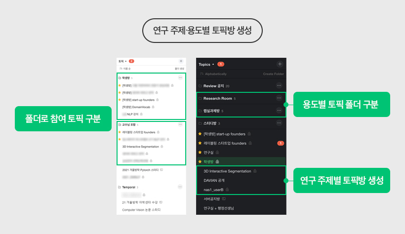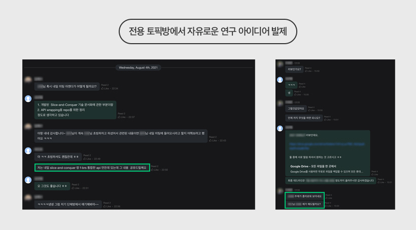 주제별 토픽방 개설로 대화 채널을 구분해 빠르게 프로젝트를 실행할 수 있습니다. 프로젝트에 따라 참여 인원 구성이 유동적으로 바뀌는 경우, 중간에 프로젝트에 투입되더라도 이전 기록을 확인할 수 있어 추가 설명 필요 없이 연구 맥락을 파악할 수 있습니다. 외부 인력이라도 필요한 일부 대화방에만 초대해 소통할 수 있는 준회원 기능을 활용해 폭넓은 연구를 진행할 수 있습니다.