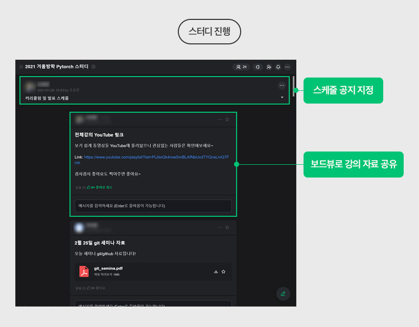 스터디도 활발하게 진행됩니다. 연구실에서나 대화방에서 얘기를 나누다 비슷한 주제로 연구를 진행하고 있다는 사실을 알게 될 때가 있는데, 그럼 바로 저희 잔디 연구 토픽방에 초대를 해서 함께 연구를 진행합니다. 준회원으로 새로 들어온 멤버도 이전 기록을 모두 볼 수 있기 때문에 연구 이력이나 흐름 파악하는 데 많은 도움을 받고 있습니다. 잔디에 스터디를 하는 데 필요한 자료를 즉각 공유하고 잔디 내 화상회의 기능이나 줌(Zoom)과 바로 연동해 회의를 진행하기 때문에 물리적으로 떨어져 있는 멤버와도 함께 스터디를 할 수 있습니다.