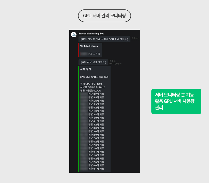 우리 연구실은 잔디 커넥트 기능을 활용해 효율적인 연구 체계를 갖춰나가고 있습니다. 딥러닝 연구를 하기 위해선 GPU(Graphics Processing Unit)가 꼭 필요합니다. 우리 연구실은 25대 이상의 서버를 자체적으로 구축해 연구에 사용하며, 여기에는 총 100여 개가 넘는 GPU가 장착되어 있습니다. 여러 대의 GPU 서버를 잔디와 연동해 챗봇처럼 주기적으로 사용량 리포트를 받아보는 식으로 효율적인 모니터링을 수행하고 있습니다. 각 연구원이 사용하고 있는 GPU의 개수를 손쉽게 파악할 수 있고, 전체 GPU 서버의 사용량 역시 자동으로 모니터링할 수 있습니다.
