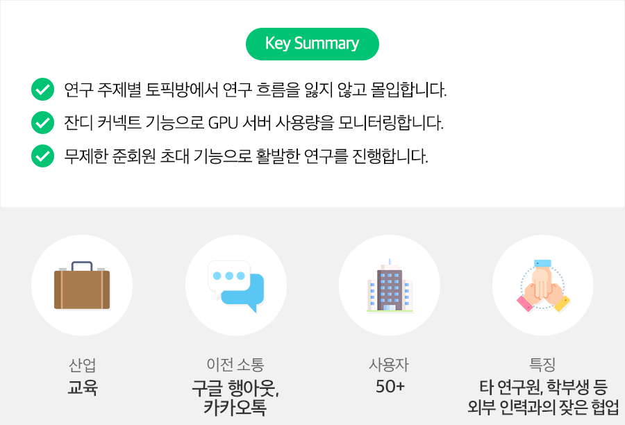 카이스트 AI대학원 데이터 시각화 연구실의 연구원들은 빠르게 발전하고 있는 AI 기술을 실제로 구현하기 위해 다양한 주제로 연구를 진행하고 있습니다. 기존에 사용하던 행아웃은 연구 주제보다 참여 인원에 따라 대화방을 나눠 소통했기 때문에 여러 연구 주제에 대한 논의가 섞이는 문제가 있었습니다. 잔디는 연구 주제별로 토픽을 만들어 소통할 수 있어 연구 흐름을 해치지 않고 몰입할 수 있는 환경을 제공합니다. 깊이 있는 연구를 하는 토픽은 물론 제안서 준비와 과제 수행 등 프로젝트성 업무를 진행할 때도 바로 토픽을 만들어 빠르게 진행합니다.