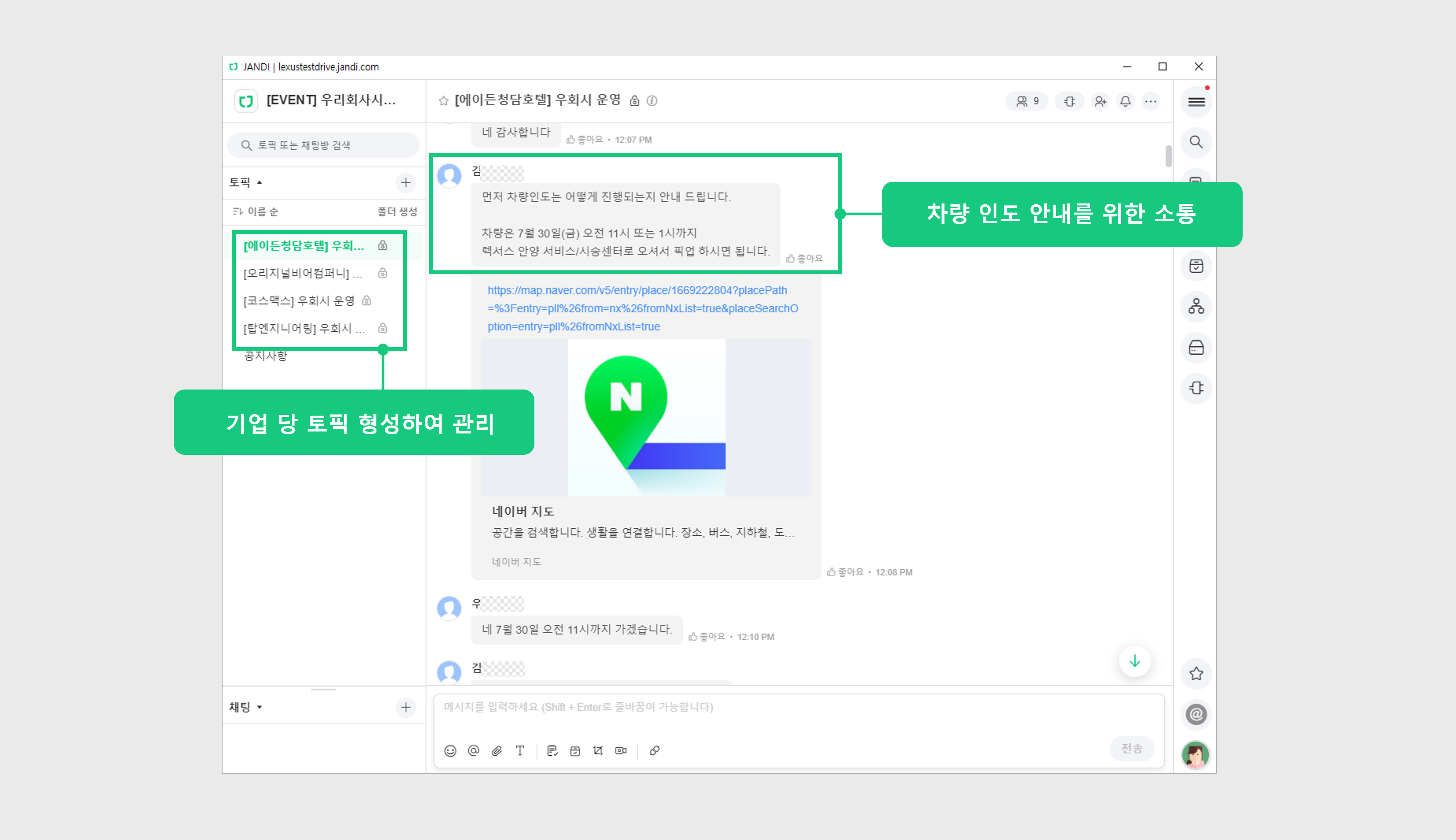 - 잔디 활용법 – 오전|오후팀 토픽을 통해 서로 업무 시간에 일어난 것에 대한 업무, 고객 컴플레인 등을 완벽히 이해 가능하여 원활한 업무 수행이 가능합니다.