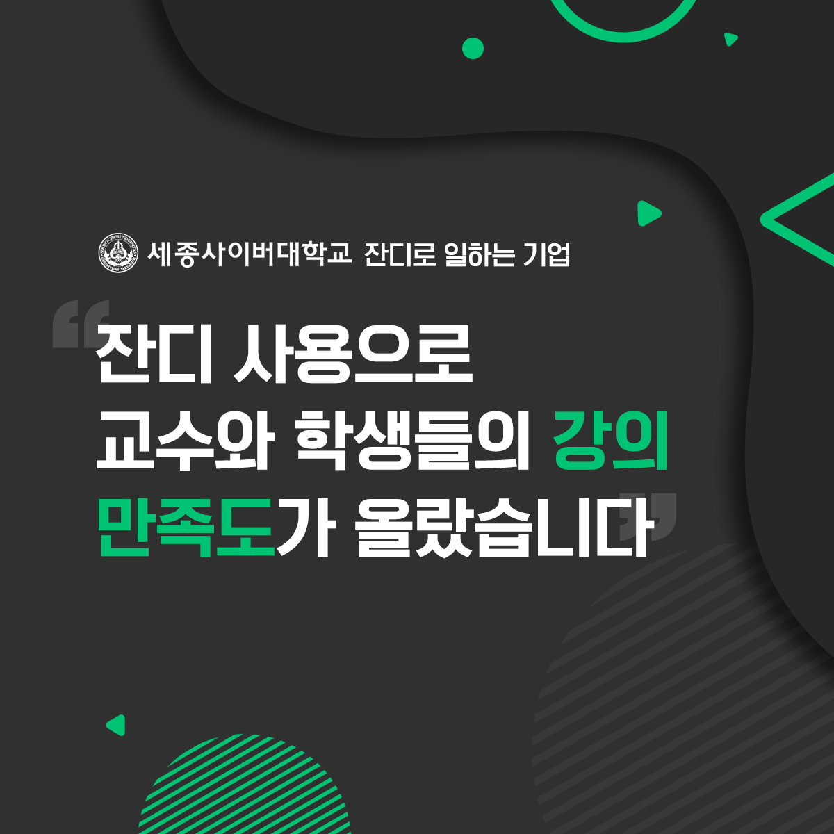 세종사이버대학교는 잔디를 교수와 학생의 실시간 소통 채널로 활용하고 있습니다. 온라인강의실(LMS)에 연동된 잔디로 학생들에게 Live 강의(보충수업)를 제공하고 있습니다. 보충 수업에 참석하지 못했던 학생들도 모든 대화와 자료가 토픽방에 남아있기 때문에 잔디로 수업 내용을 언제 어디서나 어떤 기기로든 리뷰할 수 있습니다. 잔디 사용으로 교수와 학생들의 강의 만족도가 향상되고 있습니다.