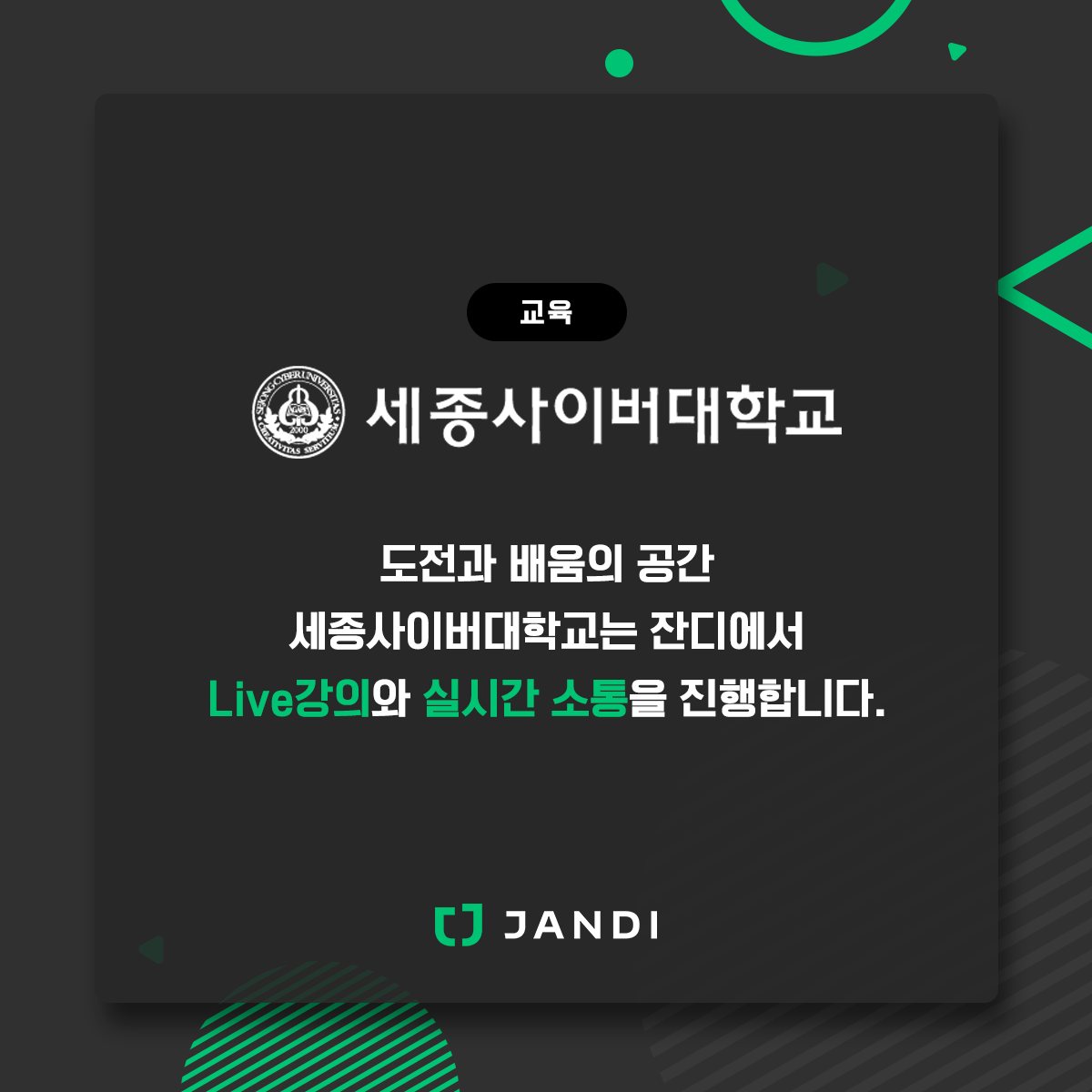 도전과 배움의 공간 세종사이버대학교는 잔디로 Live 강의를 진행하고 있습니다. 세종사이버대학교는 끊임없이 변화하는 이 시대에 맞게 새로운 삶과 미래를 준비하고자 하는 현대인에게 열린 기회를 제공하는 도전과 배움의 공간입니다.