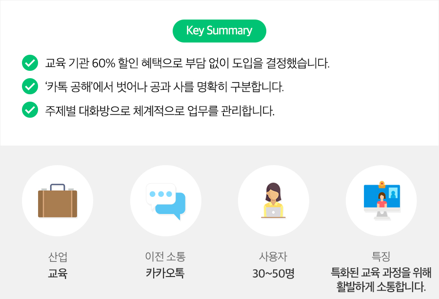 많은 대안학교가 개인용 메신저로 일하고 계실 거라고 예상합니다. 개인 메신저로 일할 때 체감했던 불편함을 업무용 협업툴 잔디로 개선하시길 추천합니다. 잔디는 인증받은 교육 기관에 60% 할인도 제공하고 있어 업무 효율성 대비 금액적인 메리트도 상당합니다. 업무 진행 상황을 체계적으로 정리해나갈 수 있는 잔디를 추천합니다.