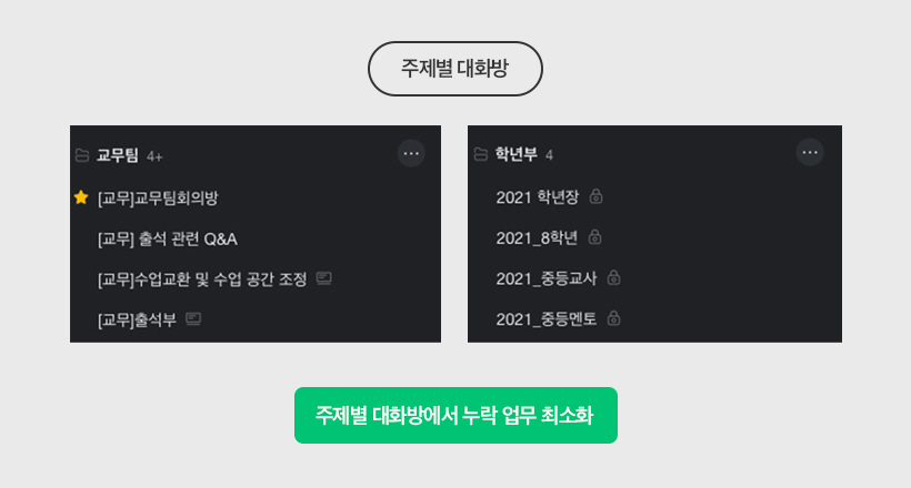 카카오톡으로 소통을 할 때는 50분 혹은 85분 동안 하는 수업을 마치고 나면 메시지가 100개가 넘게 와있곤 했습니다. 짧은 쉬는 시간 안에 그 메시지들을 다 읽지 못하고 마지막 메시지만 읽게 되는 일도 많았습니다. 중간에 있는 중요한 공지사항을 미처 체크하지 못하게 되는 경우도 왕왕 발생했습니다. 또, 교무팀은 학교에서 발생하는 상황을 끊임없이 체크하고 확인해야 하는데요. 카톡방이 너무 많이 만들어져 있어, 1대 1 소통을 해야 하는 내용도 팀 카톡방에 전달하기도 했습니다. 해당 내용을 알 필요 없는 선생님들께는 공해가 됐을 것 같습니다. 잔디를 도입한 후는 주제별로 대화방을 만들어 해당 주제에 맞는 소통만 나누고 있습니다. 잔디로 일하니 메시지 전달 대상을 세분화해 소통할 수 있어 효율적인 업무가 진행됩니다.