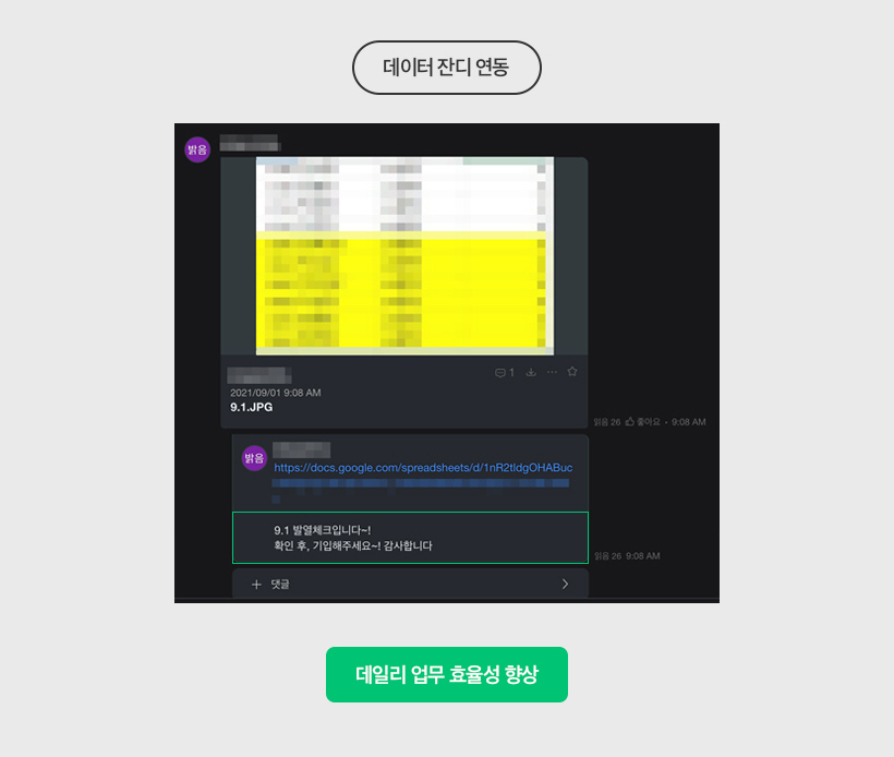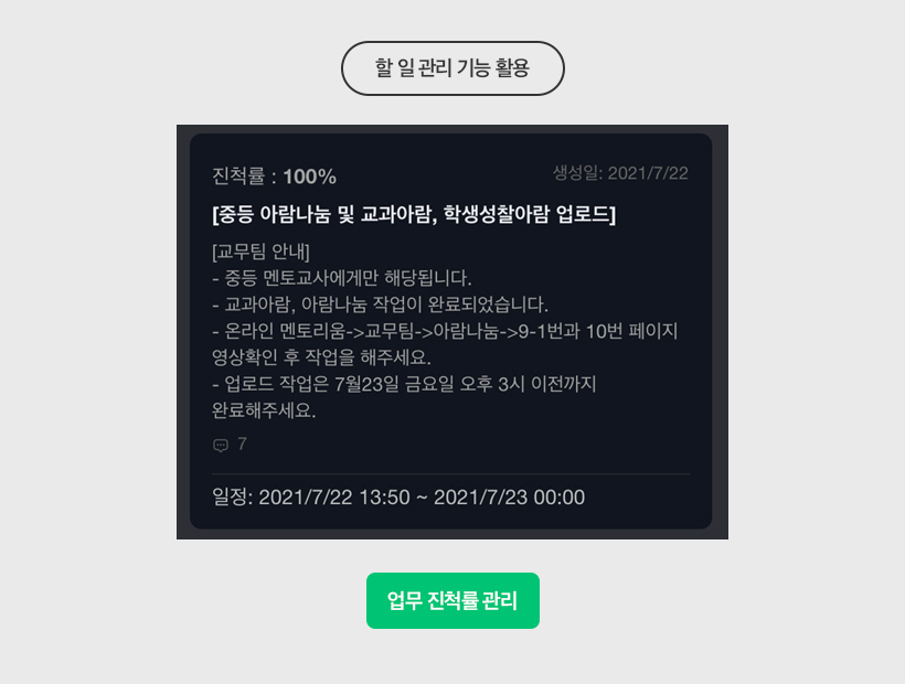 대부분의 학교가 개학과 방학 시기인 3월과 9월에 가장 바쁘리라 예상합니다. 학생들의 학교 생활기록부를 작성하는 업무 때문인데요. 우리 학교는 각 선생님의 업무 진척도를 잔디의 ‘할 일 기능’을 통해 체계적으로 관리하고 있습니다. 총 다섯 단계로 구분되는 업무 진척도를 체크할 수 있어 어느 정도 업무가 진행됐는지 알 수 있고, 한 선생님이 작업을 완료하면 모두에게 알림이 가기 때문에 잊고 있던 업무를 다시 알려주는 기능도 합니다. 잔디로 일하기 전에는 구글 시트로 업무 진행 정도를 공유했는데, 링크를 클릭해서 찾아서 들어가는 일도 어려웠습니다. 워낙 카톡 대화방이 많았기 때문입니다.