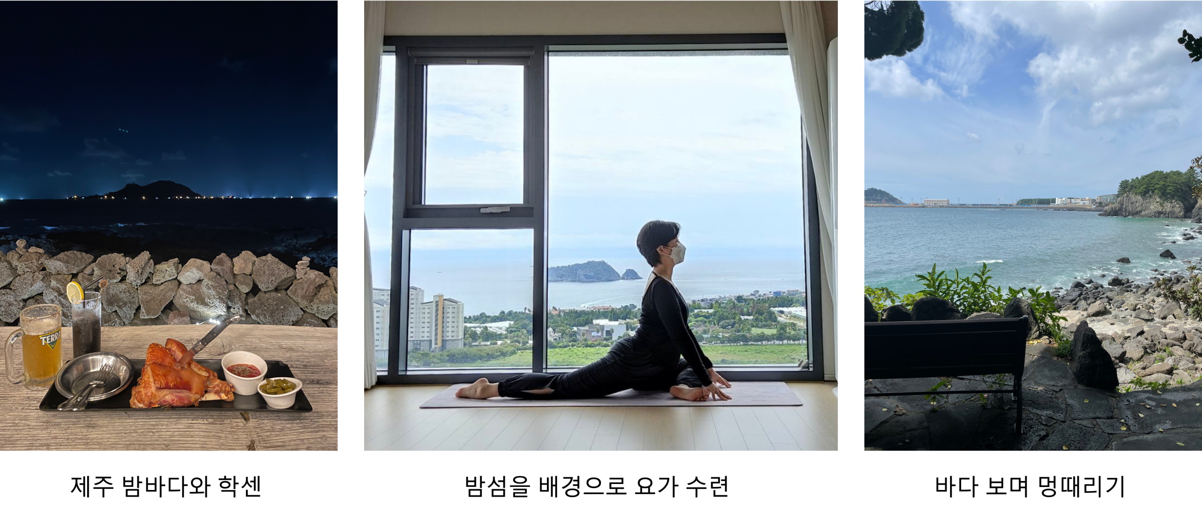 음악을 들으며 바다를 낀 올레길을 걷다가 지치면 카페에 들어가 무언가를 쓰면서 다 비워내는 일. 제주를 찾을 때마다 반복했던 여행 방식입니다. 이번엔 바다를 봤고, 요가를 했습니다. 퇴근 후 찾았던 빌딩 속 요가원이 아닌, 밤섬이 내다보이는 탁 트인 요가원에서 개인 레슨을 받을 수 있는 1:1 내 몸에 맞춘 체형교정 요가 프립 프로그램에 참여했는데요. 요가 선생님이 내 몸에 맞게 올바른 동작과 정렬을 찾아주고, 한쪽으로 치우쳐 있던 몸의 균형을 잡기 위한 동작들을 안내해주셨습니다. 앞으로도 요가를 꾸준히 수련해 더욱 단단해져 다시 찾기로 약속했습니다. 들이쉬고 내쉬는 호흡을 이어가는 요가처럼 비워내고 다시 채우는 시기를 누린 워케이션이었습니다.