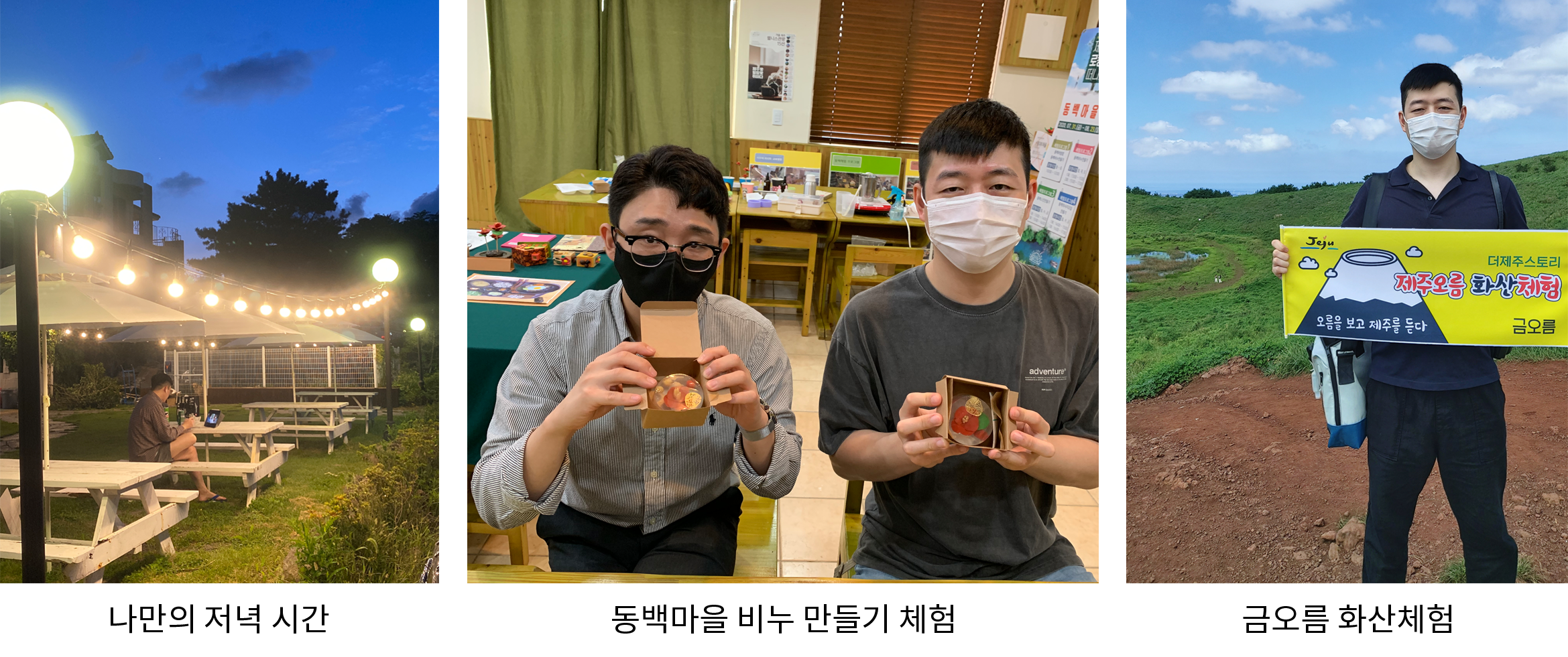 제주도에서 4박 5일간 첫 워케이션을 진행하면서 일상적인 업무와 프로젝트는 협업툴 잔디와 함께하며 차질 없이 진행할 수 있었습니다. 그러나 여기서 그친다면 저희 팀이 다녀온 것은 워케이션이 아니라 집이 아닌 공간에서 비대면 근무를 한 것과 다름이 없을 것 같습니다. 워케이션은 단순히 사무실과 떨어진 공간에서 비대면으로 일하는 것에 그치지 않습니다.