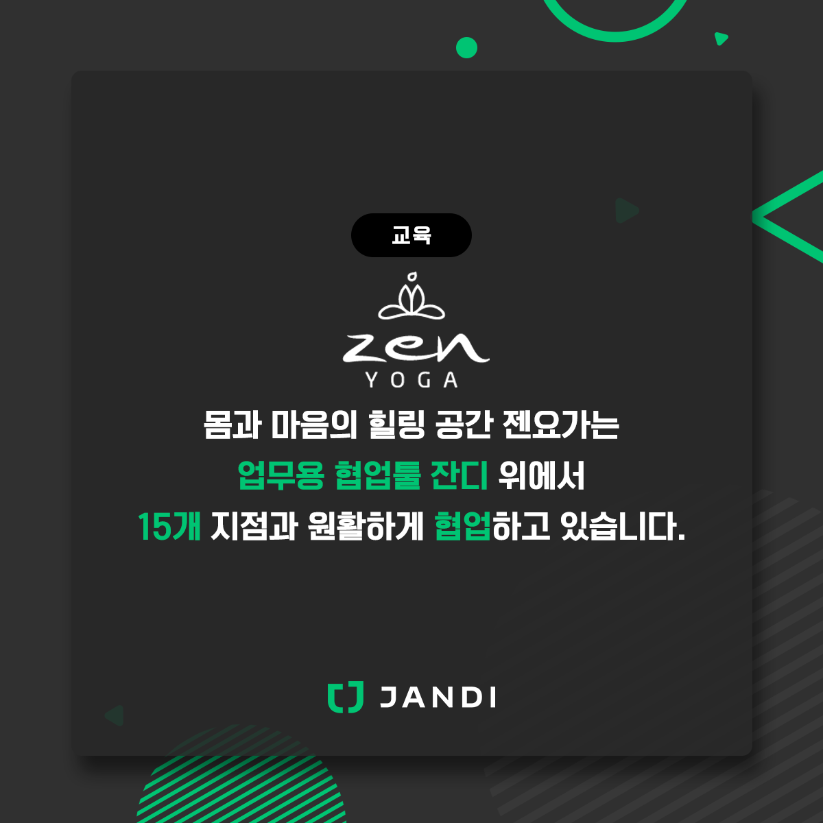 몸과 마음의 힐링 공간 젠요가도 잔디로 일하고 있습니다. 젠요가는 서울, 경기 주요 지역에 15개의 센터를 보유한 요가 브랜드입니다. 11년간의 노하우를 바탕으로 건강관리 철학을 지키며 몸과 마음의 건강을 통해 삶에 활력을 되찾고, 더 나은 삶을 만들어가고자 하는 분들을 위한 공간으로 자리매김하고 있습니다
