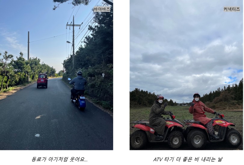 커넥터즈 🤓 저희가 제주도에 머무르는 동안 제주의 날씨는 대체로 흐렸어요. 바다를 보러 가거나 경치 좋은 곳을 구경하기에는 조금 힘들었습니다. 그래서 비가 와도 즐거운 ATV를 탔어요! 물론 안전한 범위 안에서요. 그 후 다른 액티비티를 찾아보려고 했지만 바람도 비도 강하다 보니 밖에서 하는 활동은 무리가 있어 보였어요. 그래서 제주도를 떠나기 전에 온라인으로 제주 흑돼지 키트를 구매했습니다. 선물용으로도 좋겠지만, 무엇보다도 육지로 돌아가서 워케이션 설렘을 다시 느낄 수 있을 것 같았어요!