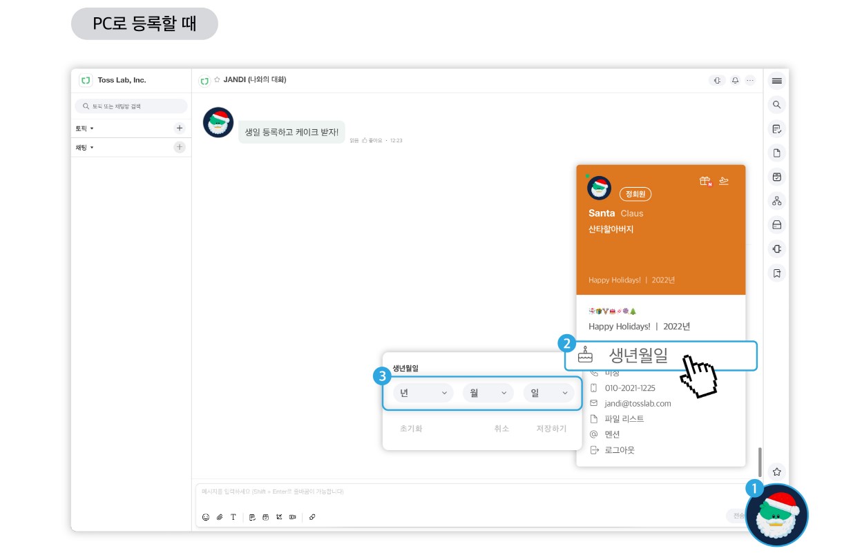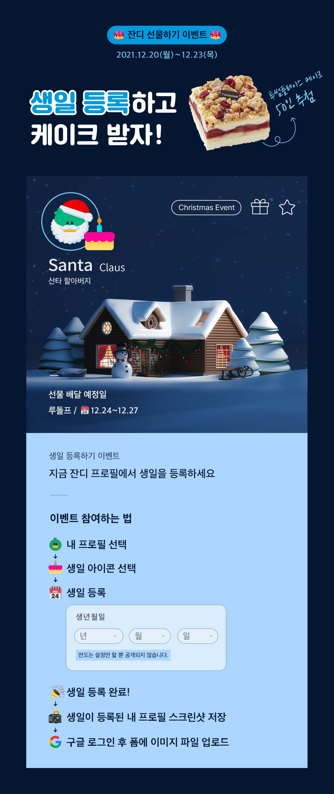 모두의 할아버지 산타클로스와 함께 하는 크리스마스🎄와 호랑이 기운이 가득한 새해✨가 벌써 코앞으로 다가왔습니다. 여러분들은 올 한 해 어떻게 보내셨나요? 잔디는 더 좋은 서비스를 제공하기 위해 정말 열심히 달렸던 한 해였습니다. 그중 지난달에 오픈한 잔디 선물하기는 국내 협업툴 시장의 유일한 서비스로 잔디 유저라면 언제 어디서나 잔디 위에서 축하와 감사를 전할 수 있습니다. 그래서 저희 잔디도 여러분들께 감사함을 전하고자 달콤한 이벤트를 준비했습니다. 이번 이벤트는 잔디 내 프로필에 생일 등록하는 것이며, 이를 통해 보다 많은 분들이 2022년 생일에 더 행복해지시길 바라는 마음도 함께 담겨 있답니다🥰.