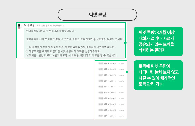 토픽 삭제는 씨넷 루팡이 3개월 이상 대화가 없거나 자료가 공유되지 않는 경우 진행합니다. 씨넷 루팡은 오래된 토픽을 정리하고 신규 토픽에 집중하기 위해 개설된 관리자입니다. 잔디 블로그 GC녹십자지놈 고객사례 ‘홍길동’1[연구소] GC녹십자지놈이 잔디의 무한한 가능성을 실현하는 비법은?을 보고 착안했습니다. 씨넷 루팡은 해당 토픽의 담당자 및 구성원의 초대로 참여해 관리자 권한을 부여받고 해당 토픽의 담당자들을 방에서 내보내는 역할을 하고 자료 보관을 목적으로 활동합니다. 토픽을 먼저 나가기 힘들었던 직원들도 씨넷 루팡을 초대해 눈치를 보지 않고 토픽을 나갈 수 있어 불필요한 토픽을 쉽게 정리할 수 있는 계기가 됐습니다.