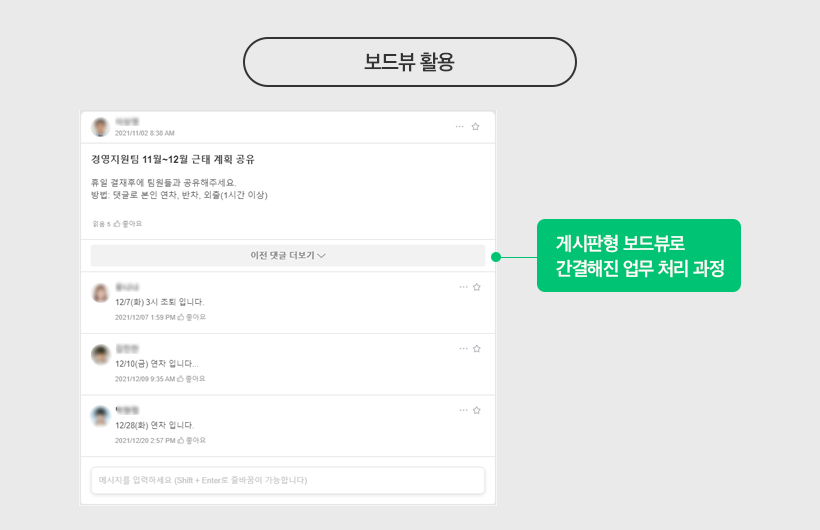 팀별로 보드뷰 토픽을 개설해 팀원의 근태와 휴가 일정을 공유하고 있습니다. 매달 게시글에 개인의 연차, 반차, 조퇴 일정을 댓글로 공유하고 있습니다. 팀원들의 휴가 일정을 확인해 업무 공백이 발생하지 않게 서로 일정을 조율하고 팀원 간의 의사소통도 더욱 활성화됐습니다.