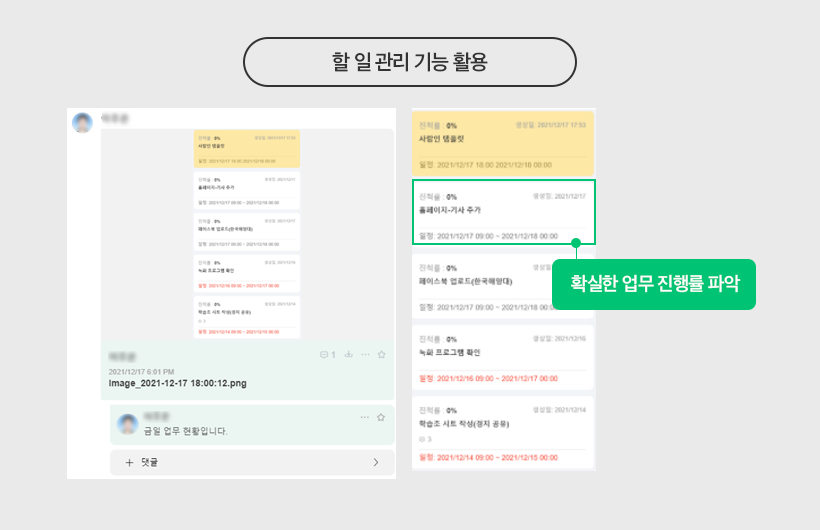 씨넷의 모든 구성원은 잔디의 할 일 기능을 통해 일일 업무를 기록하고 공유합니다. 매일 아침 할 일 목록 캡처본을 팀별 업무 공유 토픽에 업로드합니다. 할 일은 마감 기간과 총 4단계로 구분된 업무 진행률을 설정할 수 있어 업무가 진행되는 정도를 시각적으로 확인할 수 있습니다. 퇴근 시간에 맞춰 할 일 리스트를 다시 캡처해 토픽에 공유하는데요. 리더는 팀원의 일일 업무를 확인할 수 있고 팀원들은 본인의 업무를 누락하지 않고 실행할 수 있습니다. 또한, 채팅 메시지를 바로 할 일로 등록해 업무를 놓치지 않고 진행 상태를 계속해서 확인할 수 있어 일의 진행률을 편리하게 관리합니다. 잔디로 일하기 전에는 그룹웨어의 전자결재로 퇴근 시간 전까지 업무일지를 결재받아야 했어요. 지금은 잔디에서 간단하지만 확실하게 업무 진행률을 관리하고 있습니다.
