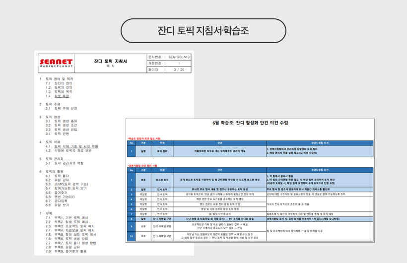 씨넷의 잔디 토픽은 전사 공지 토픽, 팀별 토픽, 프로젝트별 토픽으로 구성돼 있습니다. 씨넷은 ‘잔디 토픽 지침서’와 ‘씨넷 루팡’을 바탕으로 구성원들이 잔디를 효율적으로 사용하도록 규정하고 있습니다. 전사 공지 토픽을 통해 주요 공지 내용을 직원들에게 한 번에 쉽게 공유할 수 있고 긴급 상황 시에 미확인 멤버를 확인해 다시 한번 공지 내용을 전달하고 있습니다. 또한 팀별, 프로젝트별로 토픽을 나눠 업무를 구분하고 있습니다. 각 토픽에 업무 히스토리가 기록되어 있으니 업무 흐름을 파악하고 자료를 빠르게 찾을 수 있습니다.