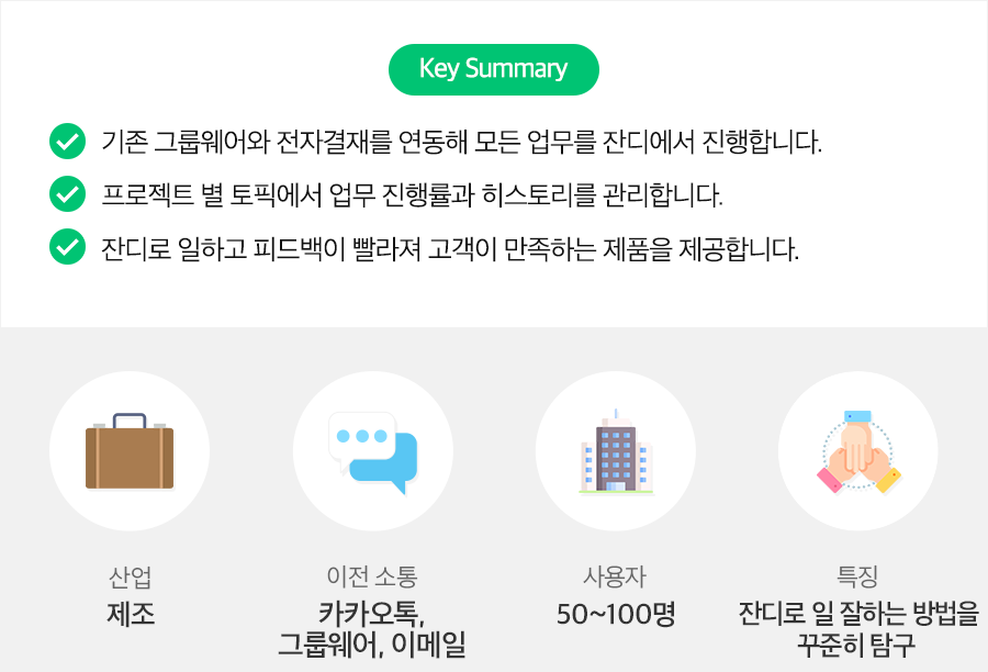 정보를 보호하며 프로젝트 단위 업무 효율성을 높여줄 협업툴이 필요했습니다. 여러 협업툴을 일정 기간 직접 사용해봤는데요. 잔디만 실시간 소통이 가능한 메신저를 기반으로 효율적인 프로젝트 관리를 지원해줘 업무 흐름을 한눈에 읽을 수 있었습니다. 주제별로 대화방을 나눠주는 잔디의 ‘토픽’은 프로젝트별로 업무를 구분해 진행하고 업무 히스토리를 영구적으로 보존해 줍니다. 담당자가 변경되어도 이전 업무 기록을 모두 볼 수 있고 스마트 검색 기능으로 빠르게 자료를 찾아 업무 흐름을 파악할 수 있습니다. 또한, 메일을 이용해 업무 일할 때보다 잔디로 일하고 나서 직원 간의 피드백이 눈에 띌 정도로 빨라졌습니다. 여기에 효율적인 업무 문화를 만들기 위한 경영진의 의지가 더해져 잔디를 전사 협업 채널로 결정했습니다.