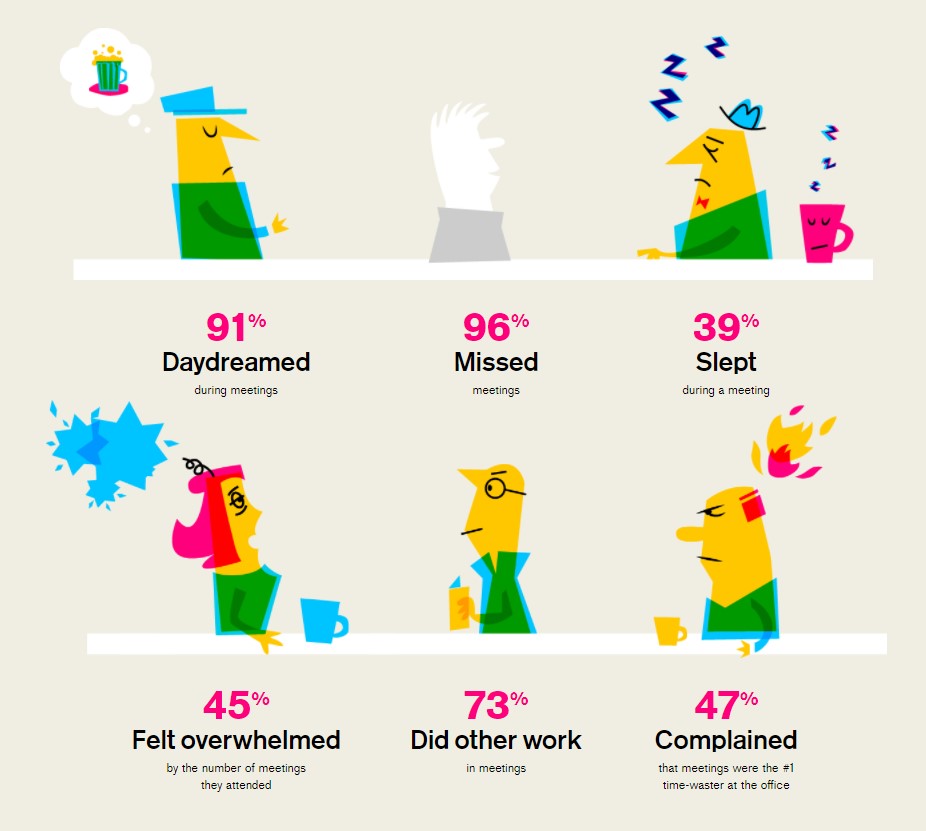 Forbes1How To Stop Wasting 2.5 Hours On Email Every Day에 따르면 직장인들은 하루 평균 2.5시간을 이메일 소통에 시간을 쓰고 있습니다. 업무 시간의 약 30%를 차지합니다. 여기서 끝이 아닙니다. 이메일 업무 후 다시 메인 업무에 집중하는데 16분이 걸립니다28 Time Wasters at Work. 미팅 시간도 상당합니다. Atlassian(2020)에 따르면 한 달에 평균 60회 정도의 미팅이 있으며, 50%의 미팅 시간은 불필요하게 쓰여 한 달 업무 시간 중 대략 60시간 이상이 버려지고 있습니다. 빠른 소통을 위해 사용되고 있는 개인 메신저와 같은 플랫폼도 업무 효율을 방해하고 있습니다. 한 조사3WORKING HARD OR HARDLY WORKING에 따르면, 원치 않은 다양한 플랫폼의 방해로 1주에 평균 8시간이 낭비된다고 합니다.
