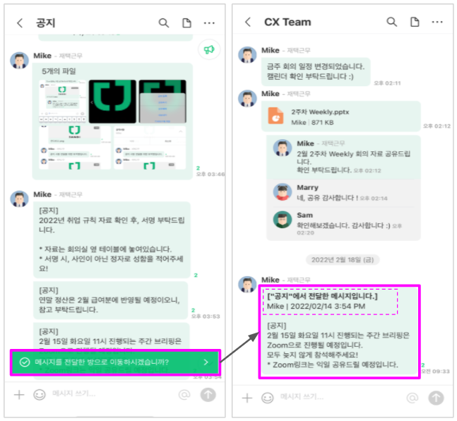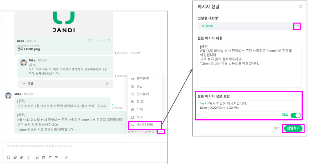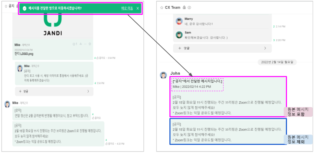 - 메시지 전달하기 후 상단 배너의 [바로 이동] 클릭 시, 메시지를 전달한 대화방으로 이동됩니다.