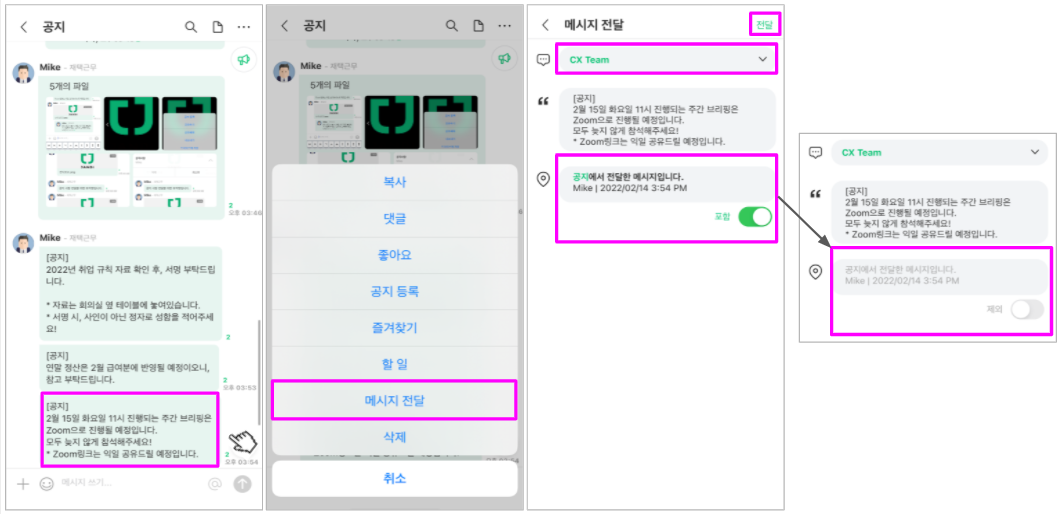 - 사용 방법 : 전달 할 메시지 길게 누르기 > [메시지 전달] > 전달할 대화방 선택 > [전달] 터치해주세요.