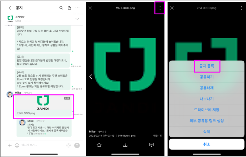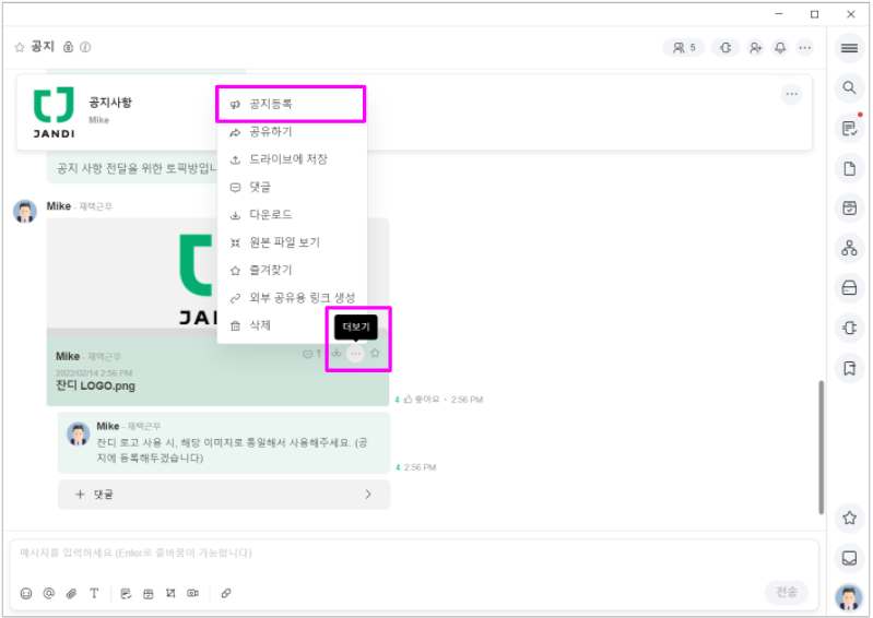 - 사용 방법 : 이미지 업로드 후 클릭 > 우측 상단 …[더보기] > [공지 등록] 해주세요.