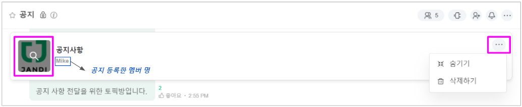 - 공지 우측의 …[더보기] 에서, 공지 [숨기기] 혹은 [삭제하기]가 가능합니다.