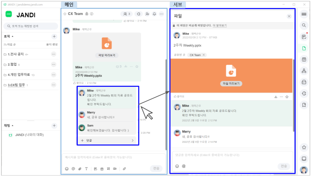 - Ctrl (Mac: cmd) 누른 상태에서 클릭한 토픽/채팅방이 서브 화면(우측)에 위치합니다.