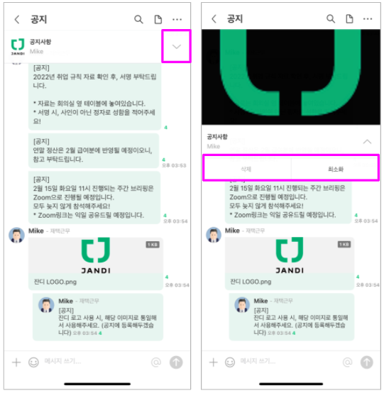 - 공지 우측의 아래 방향 표시 > 공지 [숨기기] 혹은 [삭제하기]가 가능합니다.